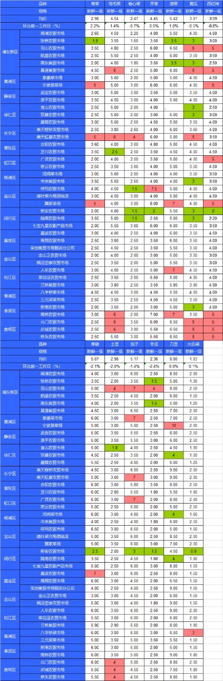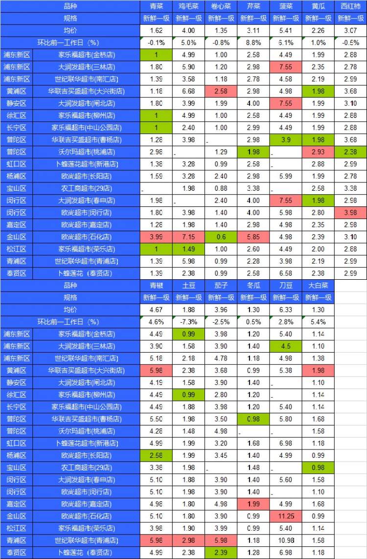 ■粉底标注代表该蔬菜品种在上述农贸市场或超市的最高价;绿底标注代表该蔬菜品种在上述农贸市场或超市的最低价