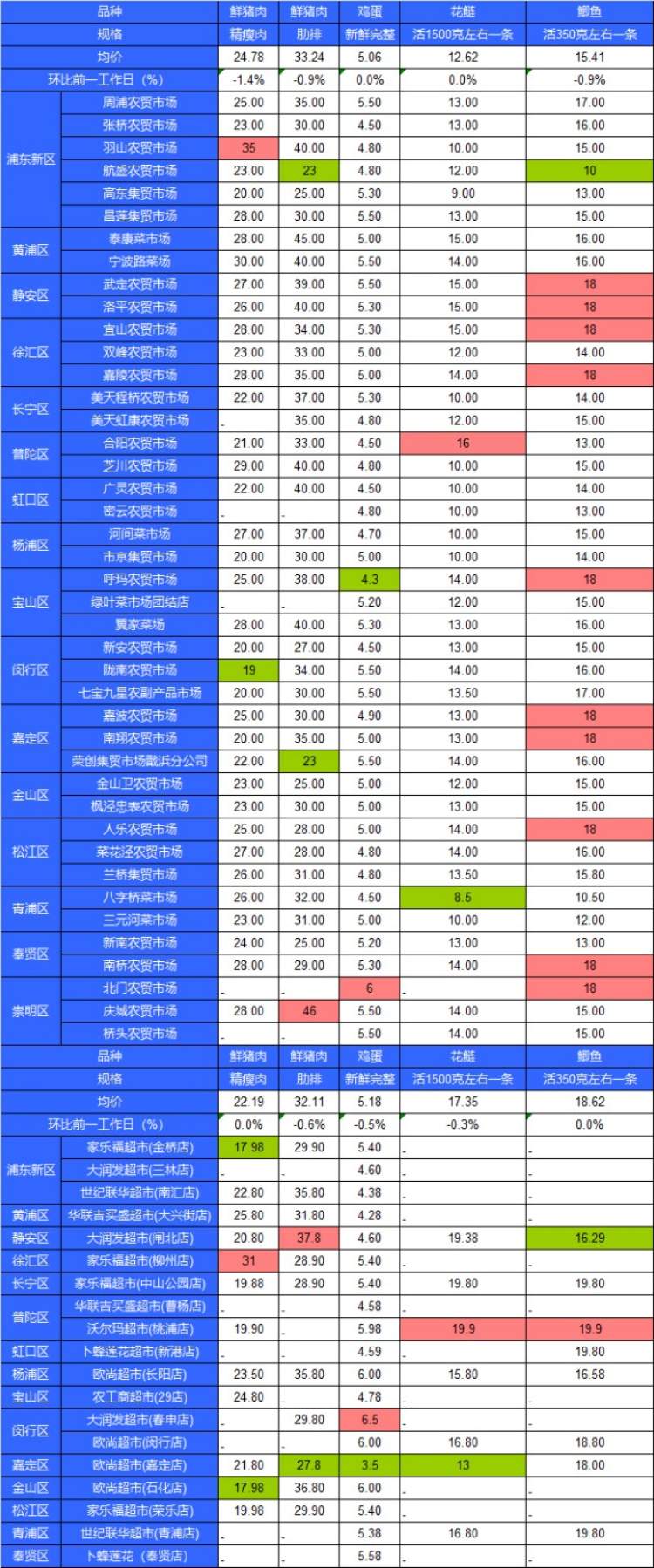 ■粉底标注代表该肉蛋鱼品种在上述农贸市场或超市的最高价;绿底标注代表该肉蛋鱼品种在上述农贸市场或超市的最低价