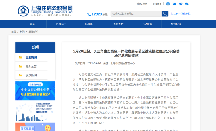 5月20日起,长三角生态绿色一体化发展示范区试点提取住房公积金偿还异地购房贷款。
