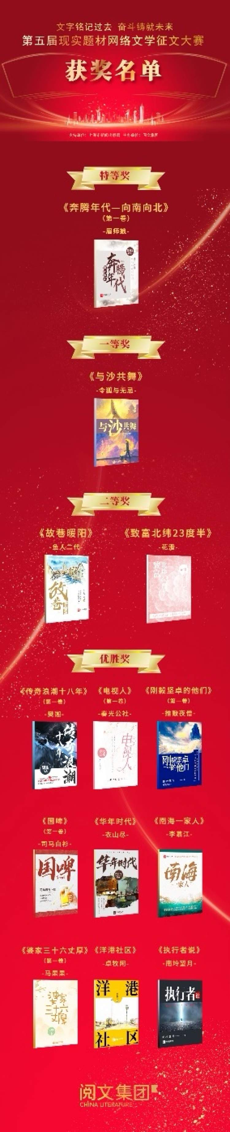 据了解,现实题材网络文学征文大赛历届参赛作品总和超四万部,由新闻出版领域的专家、知名文学评论家、网络文学资深编辑、知名作家等组成的评委团队,总计评选出五十六部优秀获奖作品。