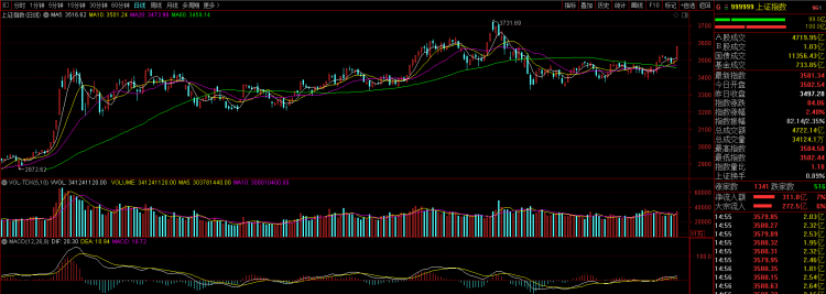 今天,沪深两市双双高开,盘中造纸、钛白粉、疫苗板块走强。银行、证券、保险板块持续拉升,北向资金早盘大幅流入超百亿元。午后煤炭股异动,兰花科创(600123)涨停,贵州茅台涨幅扩大至6%,整个白酒概念股拉升,最后沪市84点,报收3581点,涨幅2.4%;创业板大涨2.79%。北向资金净买入额217.23亿元,创历史纪录。两市成交额突破万亿。