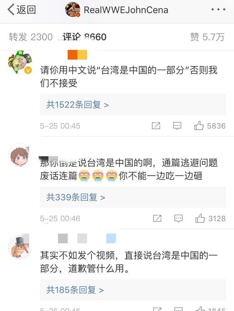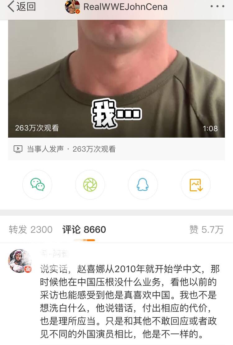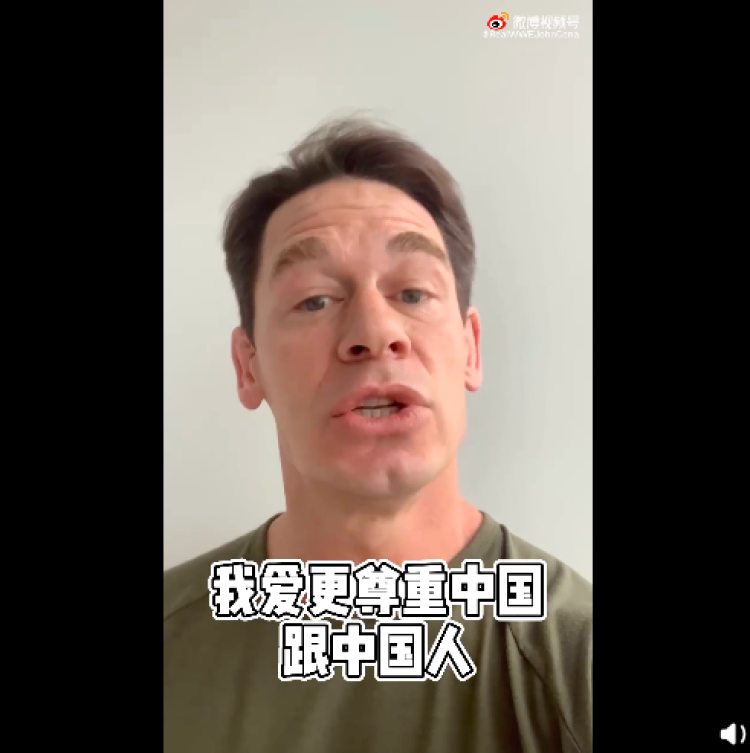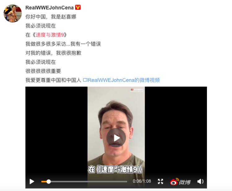 事情发酵没多久,今天凌晨,约翰·塞纳在微博上用中文发文道歉,并配上了视频。