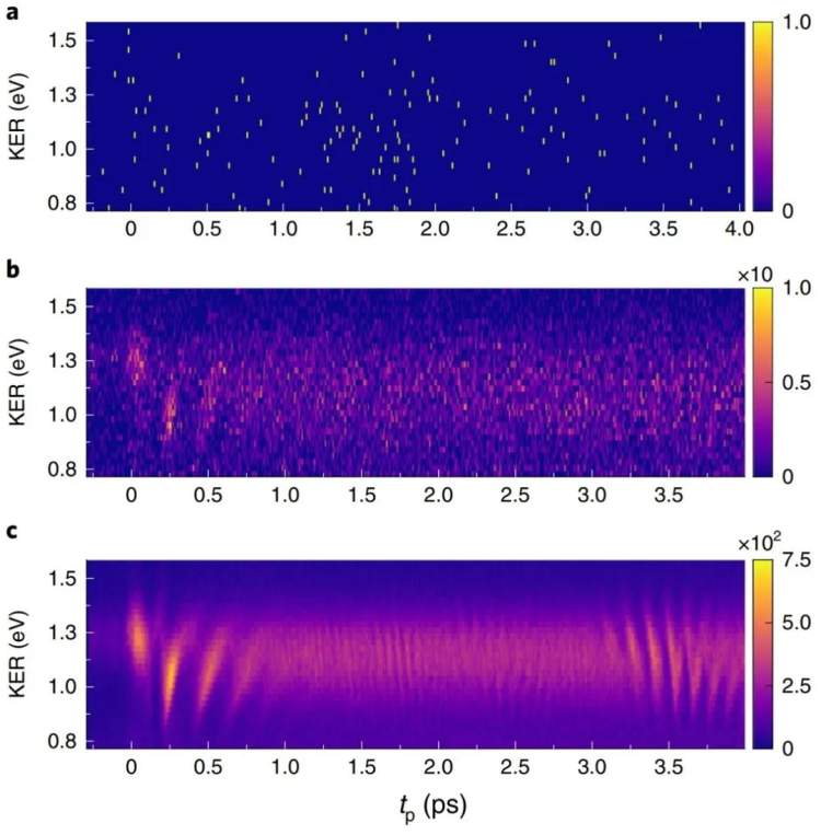 实验中,研究人员利用两束400 nm的飞秒激光脉冲激发振动回声波包,当两束脉冲延时为T时,通过泵浦-探测技术,第三束800 nm的探测光可在2T附近观测到回声信号。由于波包内的不同振动态具有不同的能量,三个明显的振荡周期过后,波包发生退相。研究人员在tp=1.36ps时施加第二束飞秒激光脉冲,利用交流斯塔克效应和解离损耗两种机制产生回声。扫描探测光的延时,使得波包发生解离即可“拍摄”振动波包回声的时间演化行为。