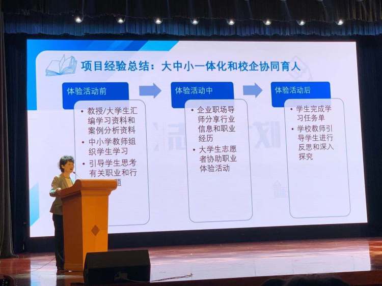 在以“实践成就梦想”为主题的展示环节,来自江宁学校、曹杨中学、宜川中学、同济大学第二附属中学、中远实验学校、晋元高级中学、华东师范大学第四附属中学和新普陀小学八所学校的学生们通过TED演讲、情景剧、产品推介等方式展示了生涯实践活动的成果,用生动的方式演绎了他们在实践基地的所见所闻、所思所想,将实践体验活动所得的感触和感悟幻化成对现实事物改进的积极动机和创新尝试。成果展示将本场活动的气氛推向高潮,获得了行业专家的高度评价与赞扬。之后,复旦大学社会发展与公共政策学院俞志元副教授做了题为《大中小一体化、家校社合作下的生涯教育》的微讲座。