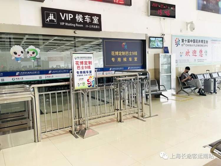 交运巴士长途南站是花博定制巴士9线指定上车点,花博定制巴士的引导标识全部就位,乘客可以在花博专用候车室候车,花博会的宣传在站区随处可见。