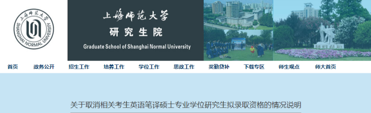 上海师范大学研究生院官网最新发布的一则“关于取消相关考生英语笔译硕士专业学位研究生拟录取资格的情况说明”称——