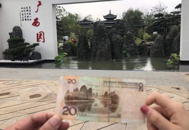 逛花博会,记得随身带一张20元人民币。因为,来到广西园门口,你就可以骄傲地拿出这张人民币,和园子入口的“桂林山水”合影了,这处桂林山水造型正是20元人民币上的桂林山水图案。