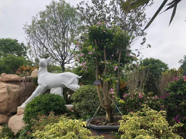 园内的一汪池水模拟的是万泉河;沙子是从海南运来的海沙,摸上去细腻,仔细看,里面还有贝壳,抬头,椰子树上还挂着多个椰子,这无疑就是三亚海边了。展园一隅,站着一头鹿,这当然是“鹿回头景区”了。