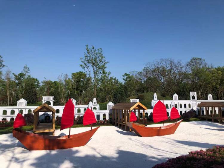 绕到花墙后的区域,老香港的风貌展现在眼前,以开埠初期的货运码头、帆船和货仓等景物为设计蓝本,并种植香港原生的土沉香树,营造出浓浓的港式风情。据说由于香港早期通过港口大量输出土沉香树,“香港”一名由此而来。