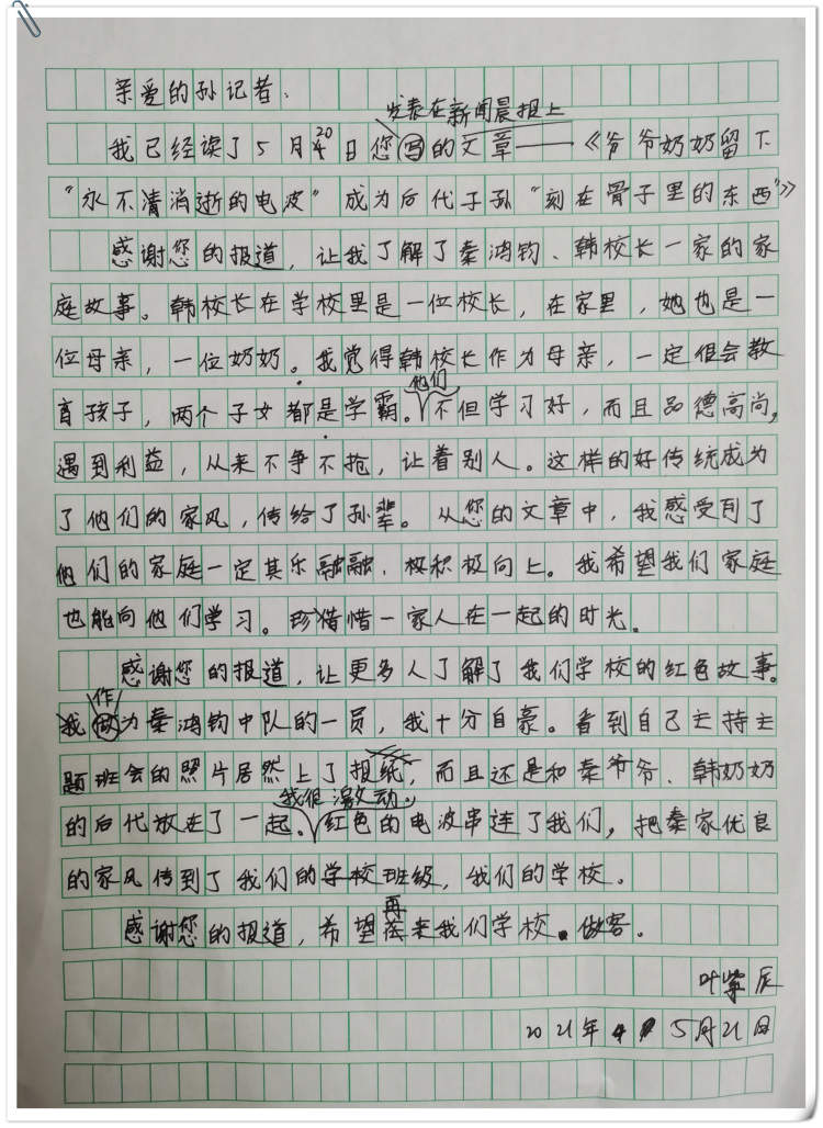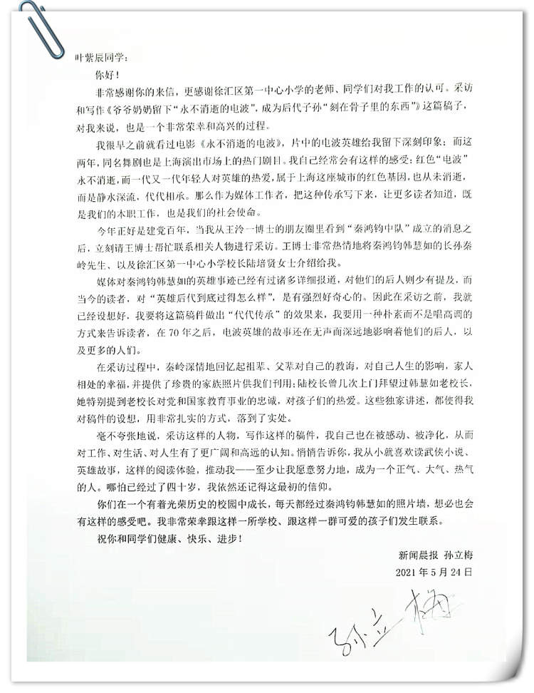 非常感谢你的来信,更感谢徐汇区第一中心小学的老师、同学们对我工作的认可。采访和写作《爷爷奶奶留下“永不消逝的电波”,成为后代子孙“刻在骨子里的东西”》这篇稿子,对我来说,也是一个非常荣幸和高兴的过程。