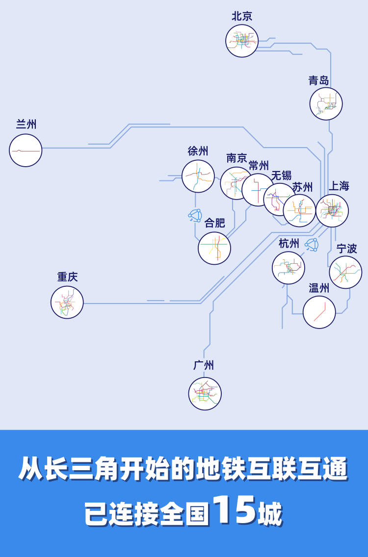 2019年7月,上海和青岛实现地铁互联互通。2019年12月,长三角十城地铁实现互联互通。上海,杭州、宁波、温州、合肥、南京、苏州、无锡、徐州、常州10城实现地铁一码通行。