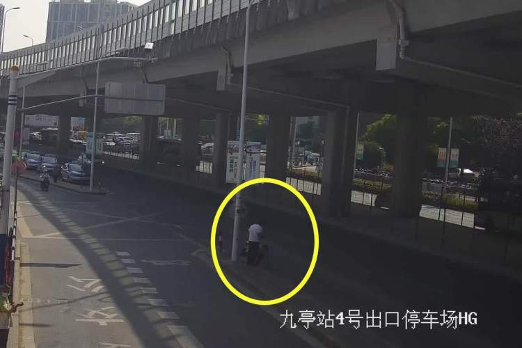 8点53分,两位在路边的男子在丁女士下车附近的地方,弯腰从地上捡走了东西。