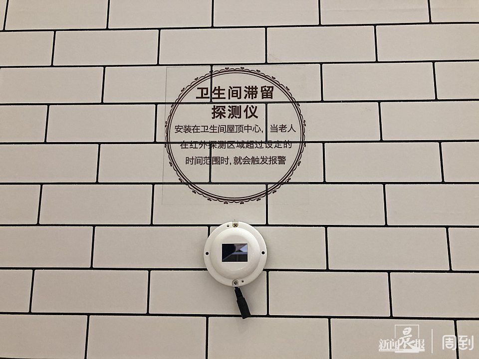 浴室内的地面可以进行防滑处理,固定可折叠沐浴凳可以让老人舒适地坐着洗澡也能方便照护人员助浴,马桶旁的单边U型扶手可以帮助老人起身扶一把,不用的时候还能上翻。安装在卫生间屋顶中心的卫生间滞留探测仪,当老人在红外线区域内超过设定时间就会报警。
