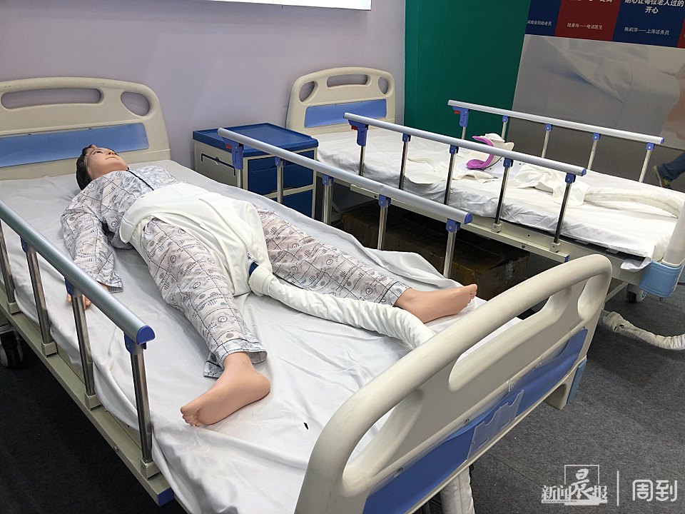 在展台上,一个人偶躺在那里。对于很多失能老人来说大小便时是无意识的。伊利诺穿戴式大小便护理机器人目前在护理院使用的比较多,由密闭式包裤、两根管道、感应线和处理机组成。病患躺在床上大小便后,机器人能立刻感应到,把水和排泄物的混合物抽吸出来,烘干收集到设备中。同时温水从另一根管子上来,冲洗下身后,再慢慢烘干。