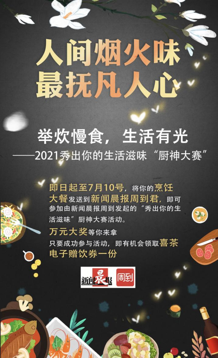 眨眼间,2021年也将过半,在稀疏平常的工作生活之余,美食或许是最能治愈人心的东西。无论是可以大快朵颐的鲜香热食,或是充满生活相遇仪式感的创意料理,还是充满记忆里的家的熨帖味道。这些人间烟火的美味,最能抚平凡人的内心。今年,新闻晨报周到再次发起“秀出你的生活滋味”厨神大赛,让我们一起举炊慢食,点亮生活之光吧。