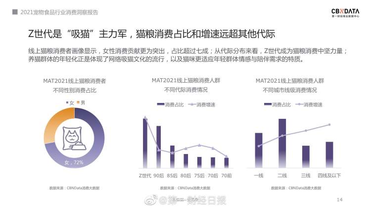 从年龄代际来看,90后成为宠物消费主力,而Z世代则成为“吸猫”主力军,其猫粮消费占比和增速远超其他代际。