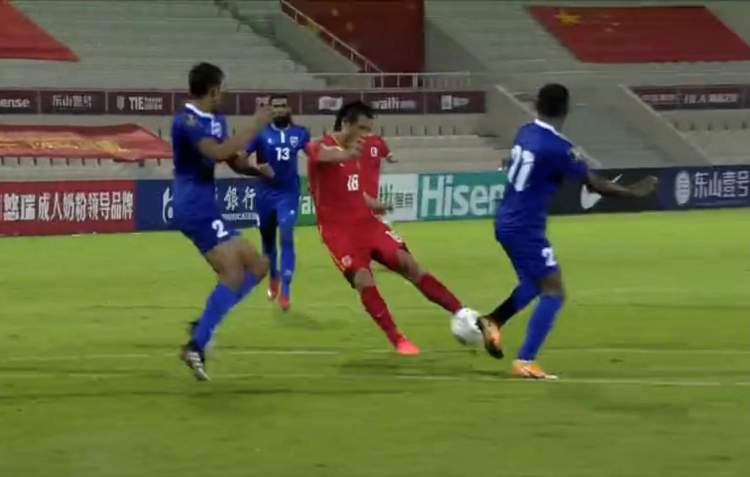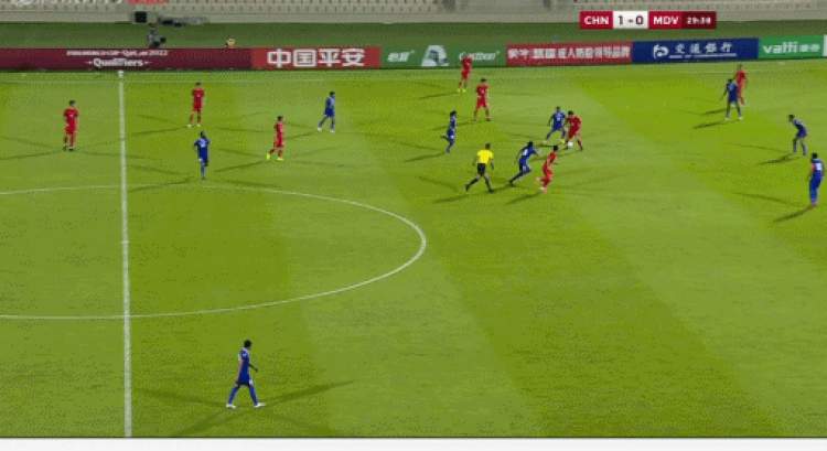 重新开球后,国足的第一次进攻就取得了进球。蒿俊闵把球断下,张玉宁得球后转身,漂亮摆脱对方两名队员,接着禁区外起左脚怒射破门。