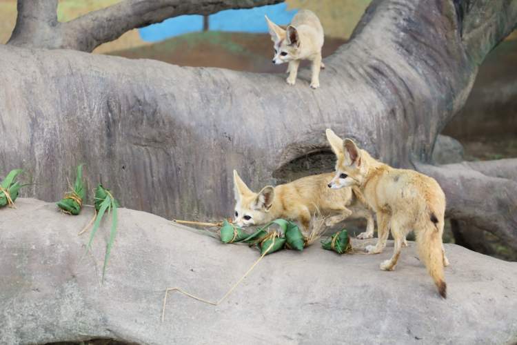 芦苇叶将鲜嫩的牛肉、鸡肉包裹成迷你三角粽,这是分给耳廓狐家族的粽子,小家伙们一拥而上,各自找到最舒适的位置开吃起来。