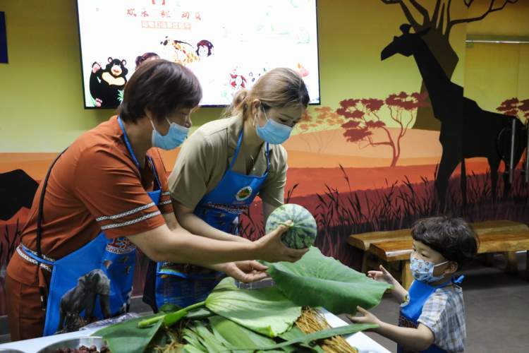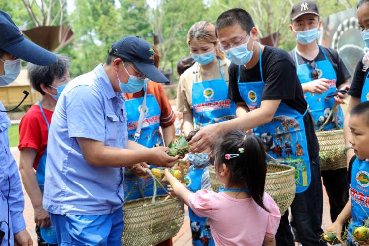裹粽叶、填馅料、缠绳线,经过1个多小时劳动,一个个动物特制粽子包裹完毕,孩子和爸妈一起将粽子装入竹篮,跟着动物保育员整队出发,去给动物们送粽子。