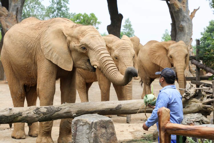 半个南瓜,把瓤掏空,填上苹果、香蕉、胡萝卜等蔬果,再用大片的荷叶包裹起来,这是属于非洲象的粽子。大象并没有一口吞下而是用特别灵敏的象鼻将荷叶剥开,吃里面的馅。