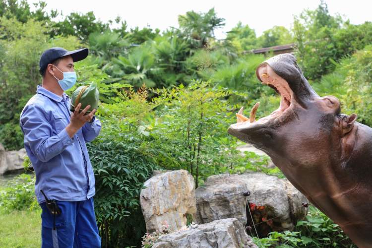 一整个西瓜用芭蕉叶或荷叶裹起来,再用稻草绳扎牢,这是给河马家准备的粽子。整个西瓜在河马的嘴里爆开,如同榨汁机般,鲜红的汁水从河马的嘴边滴落下来,看得现场的游客恨不得拿杯子去接。