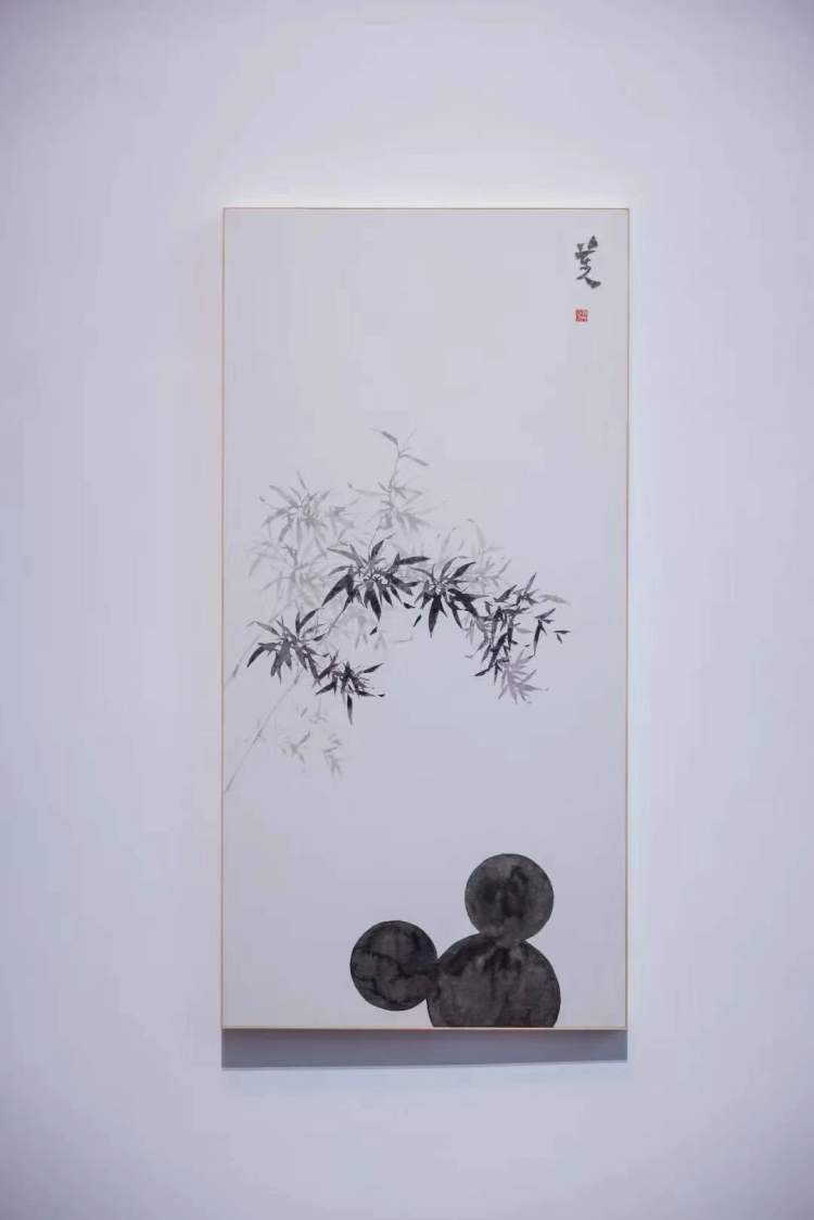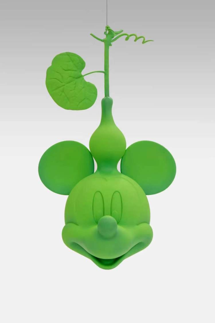 中国艺术家创作的米奇作品里,张心一的《梦网》选取了米奇手臂这一标志性符号作为创作元素;邓乃瑄的《平行世界》则与传统工匠合作,诠释他们眼中不同的米奇;贺天琪的《魔幻米奇》中的米奇仿佛正托腮沉浸在魔幻世界中思考;《三个米奇》中,黄启覃运用电脑制图技术将三个从网络上搜寻到的米奇形象进行罗列重叠,给观者带来熟悉而又模糊的视觉体验;陆平原作品《葫芦》从中国传统神话的生命观中汲取灵感,将米奇的头部造型与葫芦相结合,使不同文化在作品中相互交融;陈粉丸的《米奇能量图》为米奇虚构出缤纷交错的脉络;《米奇观竹图》中,艺术家陈杰用泼墨、撞水的传统绘画方法呈现剪影式的米奇图像,空灵、虚静的东方美学画面中闯入的一位好奇而活泼的客人。