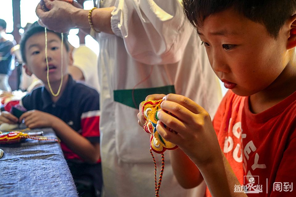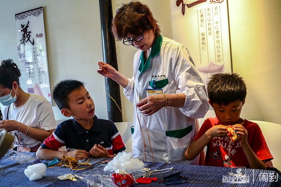 参与端午香囊DIY活动的小朋友和家长,跟着余天成堂药师学习制作香囊。
