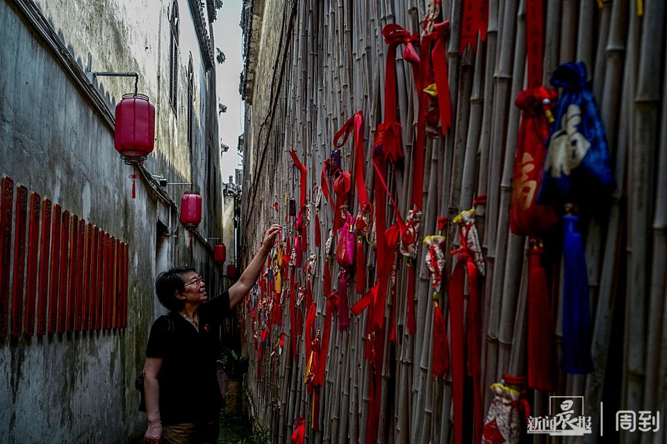 悠长的雨巷山墙上写着的,正是戴望舒的《雨巷》,这首诗也是诗人当年寓居松江时所作。一边的竹篱笆上挂着一个个香囊,整个雨巷飘着一丝清新的草木香。