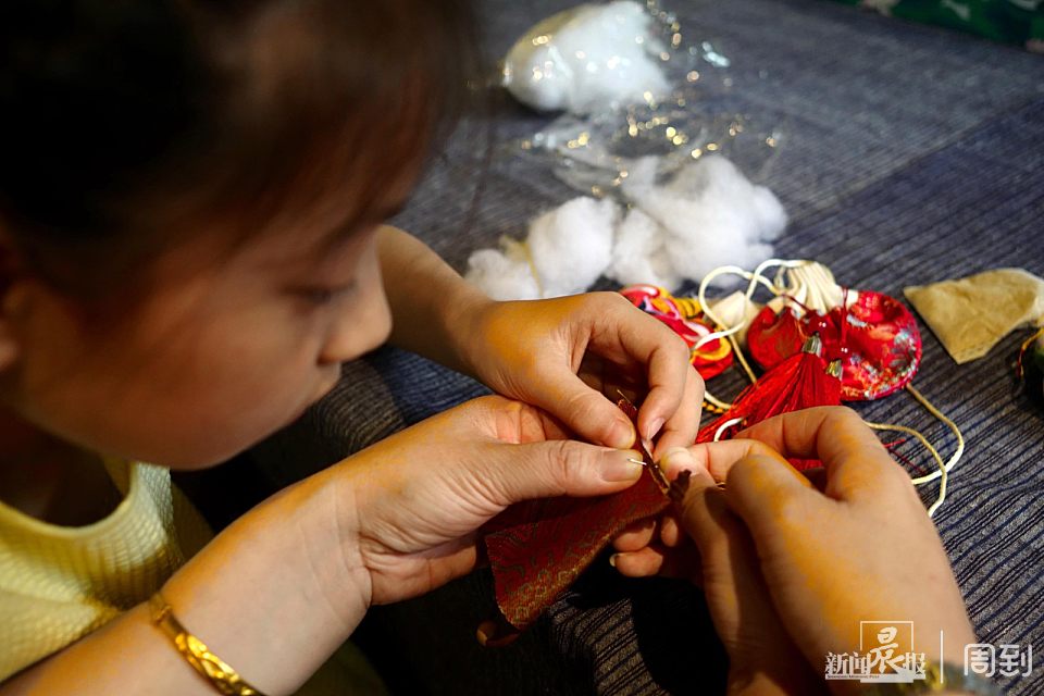 花布、彩绳、针线、香料、挂饰,家长与孩子手把手一针一线地缝着香囊,一个个精致小巧的香囊就做成了。