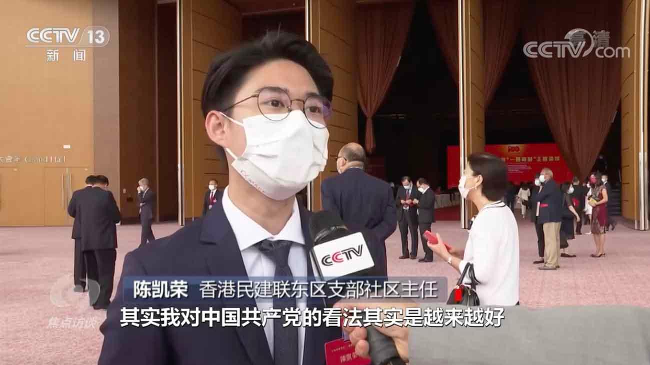 香港民建联东区支部社区主任 陈凯荣:作为香港年轻人,我对共产党的看法是越来越好,国家由过去落后的情况走到现在,越来越进步,甚至在科技上领先世界很多其他的地方,这是一个很艰难的过程,这当中最大的功劳和领导者是共产党。考虑到这一点的时候就必须知道,这不是一件容易的事情,大家很珍惜。