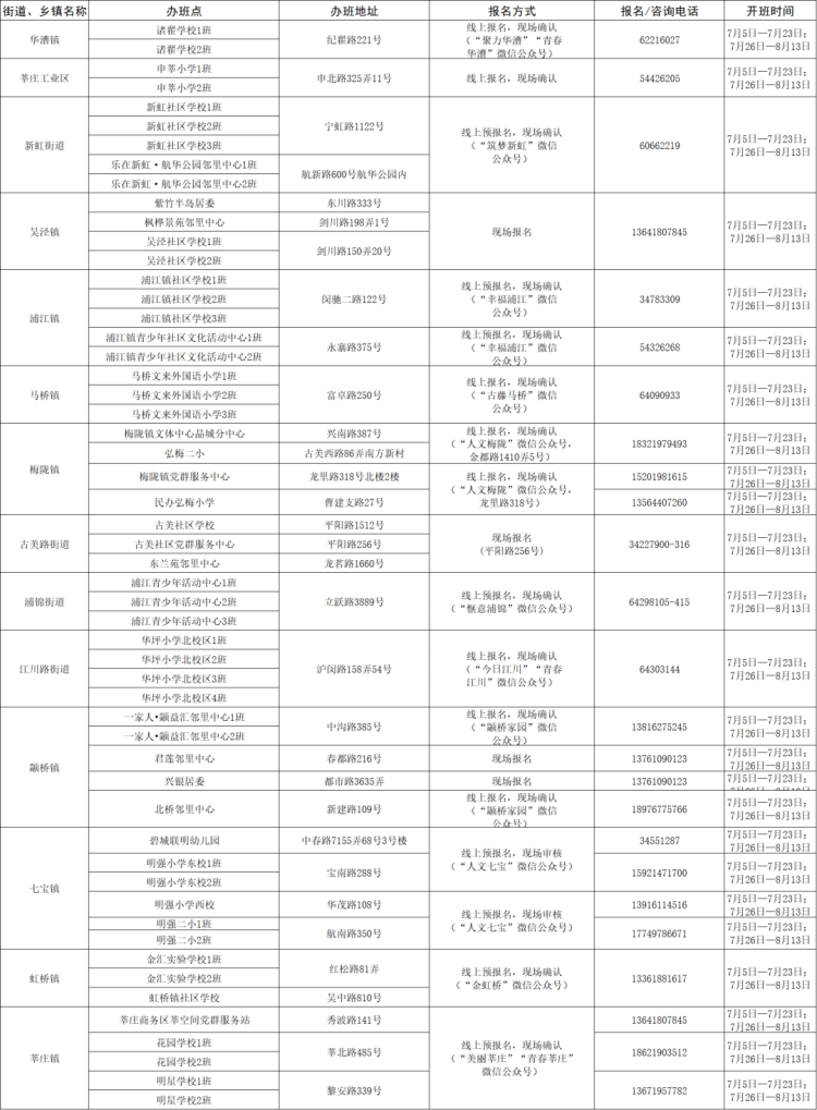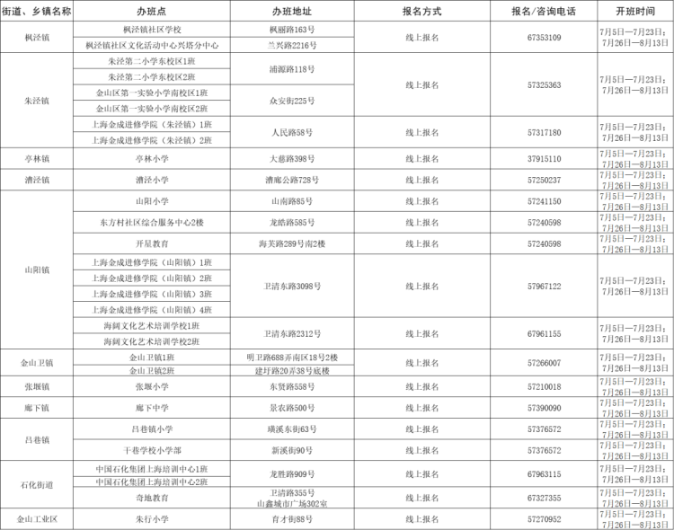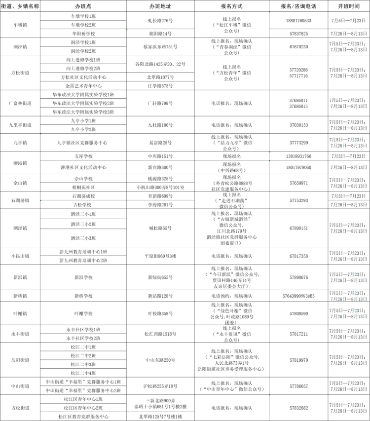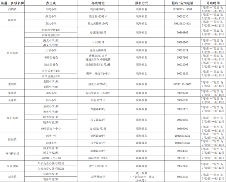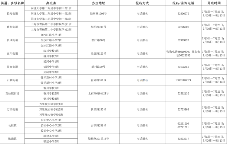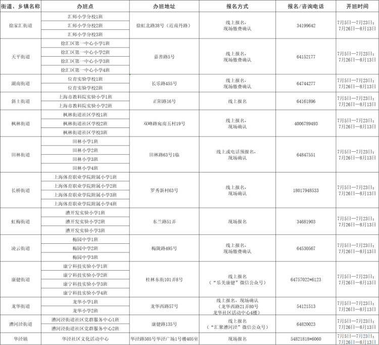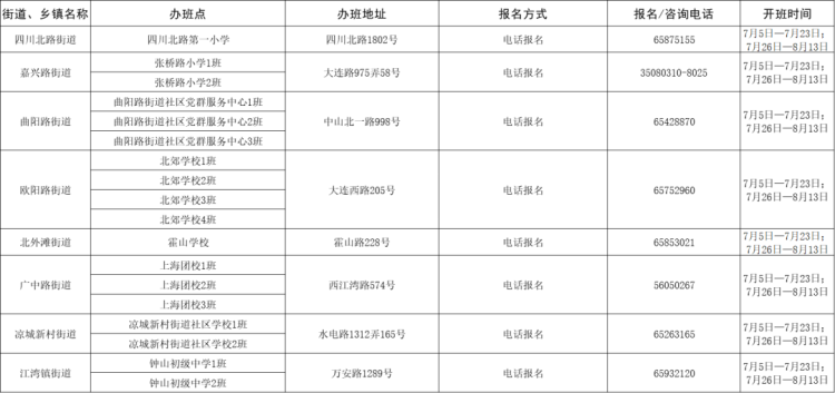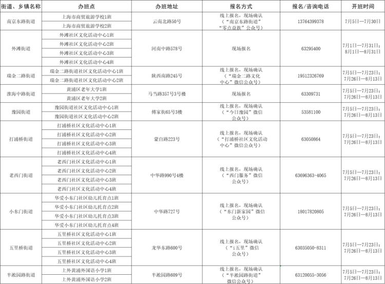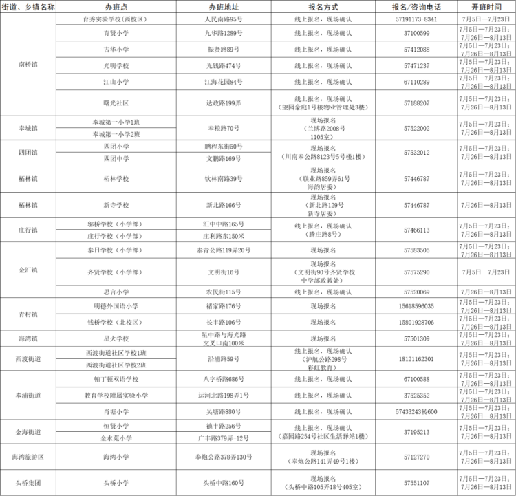 各办班点的报名时间原则上不得早于6月21日(下周一)。各办班点结合自身实际情况公布报名方式,包括现场报名、电话预约、线上报名等多种方式。