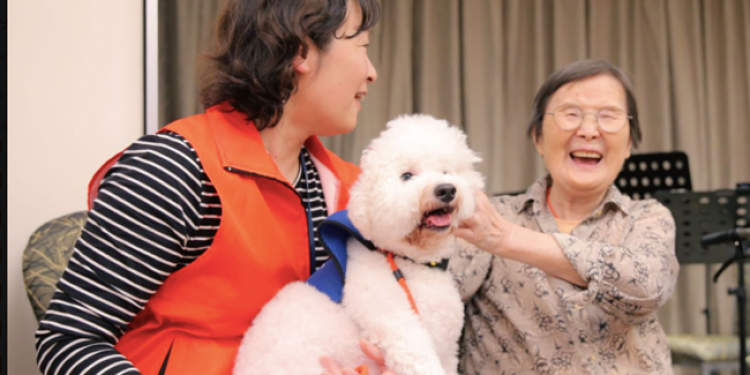 这是一家外资养老机构,他们使用治疗犬,在全世界各地都有过实践经验,我们和他们合作也是一种学习。”