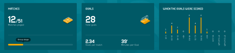 在进球时间上,46-60分钟和76-90分钟这两个时间段,进球最多,各自都有8球。接下来是16-30分钟和61-74分钟,各有4球。而上半场31-45分钟只有2球,1-15分钟只有1球,90+只有一球。从数据上来看,小组赛首轮进球多集中在下半场,尤其是下半场的开局和收尾这两个阶段。