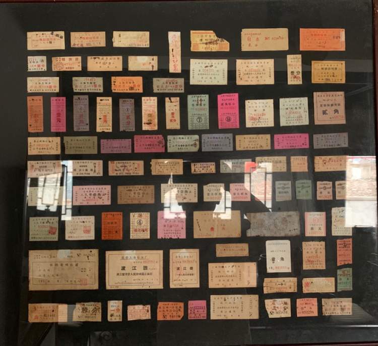 在实物展品方面,有当时的麦乳精、光明全脂奶粉瓶等、上海牌胶卷、小朋友玩的游戏棒、光明牌出的酱油、劳动车、二轮车等吊牌、有五十年代的方便面——圆蛋面、五、六十年代的公用电话簿等。还特别展出了几十种早期黄浦江摆渡、划船等票证。