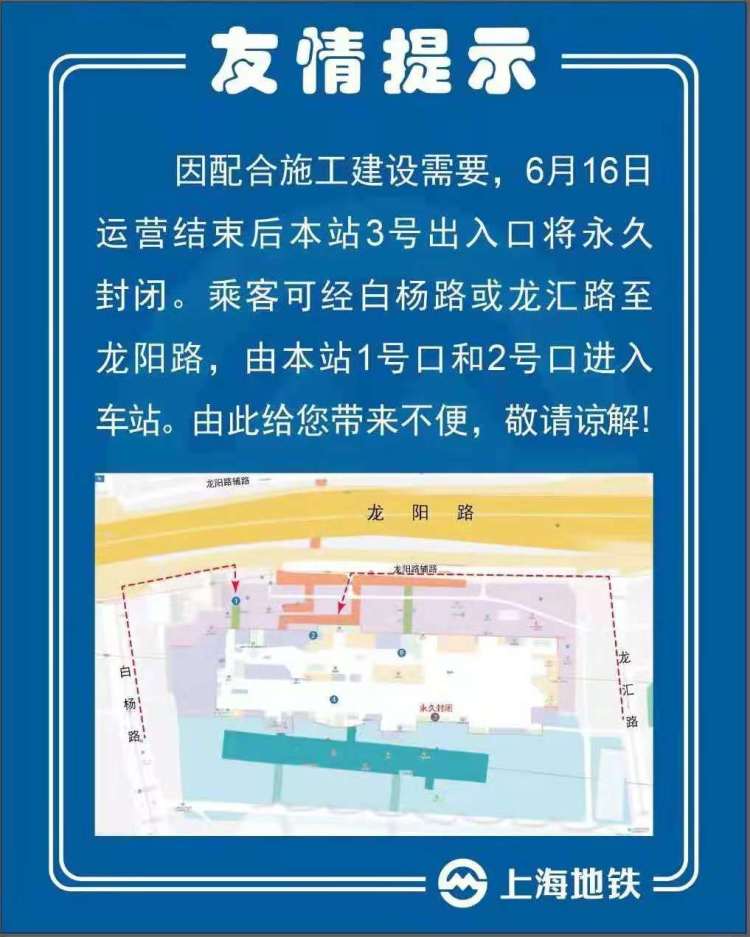 周到君今天下午从地铁2号线获悉,为配合施工,2号线龙阳路站3号口将于今天运营结束后永久封闭。明天开始,封闭改造的1号口将重新开启。届时,车站1号口将实施“只进不出”单向进站,4、6号口实行“只出不进”单向出站。