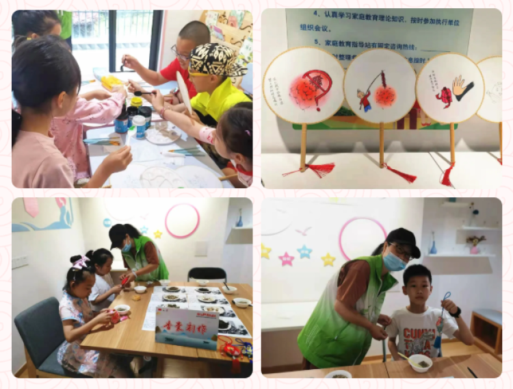 在随后进行的“大手牵小手,共同感受节日文化”环节,指导老师带领大家一同动手制作香囊、手绘团扇等端午节传统饰品。在老师的悉心指导下,大家穿针引线、研磨提笔,将原本普普通通的布料变成了色彩斑斓、形状各异的香囊;素色的团扇上也勾勒出了一幅幅精致的图案。