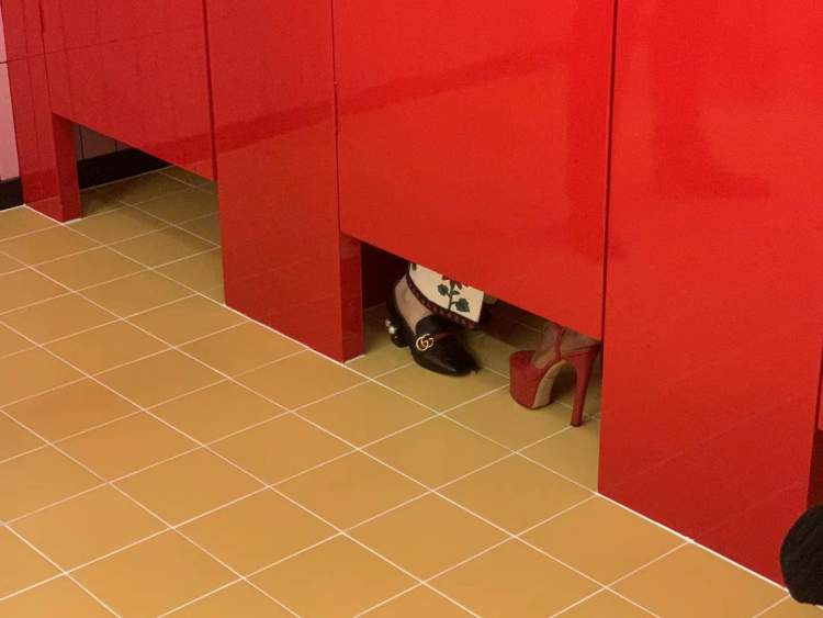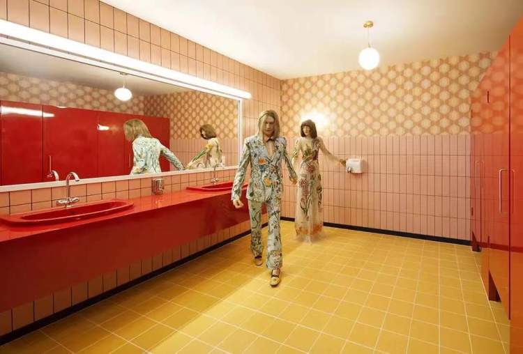 大家有没有发现,厕所门下还露出另外两位模特的脚了,穿着的也是有代表性的GUCCI鞋款。这里绝对可以算是这个展览的最知名的打卡点之一了!