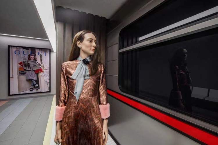 最后的出口通道旁,一个穿着时髦的都市丽人正在站台等地铁——灵感来源则是2015年GUCCI秋冬广告形象片中的视觉形象。特别的是,当观众靠近时,地铁车厢门会自动打开,正对的屏幕会播放起整个展览的介绍、幕后人员等信息。通过广告场景的动态化,让观众们在逛展临近尾声时,还能收获一个小小的惊喜,策展人有心啦~