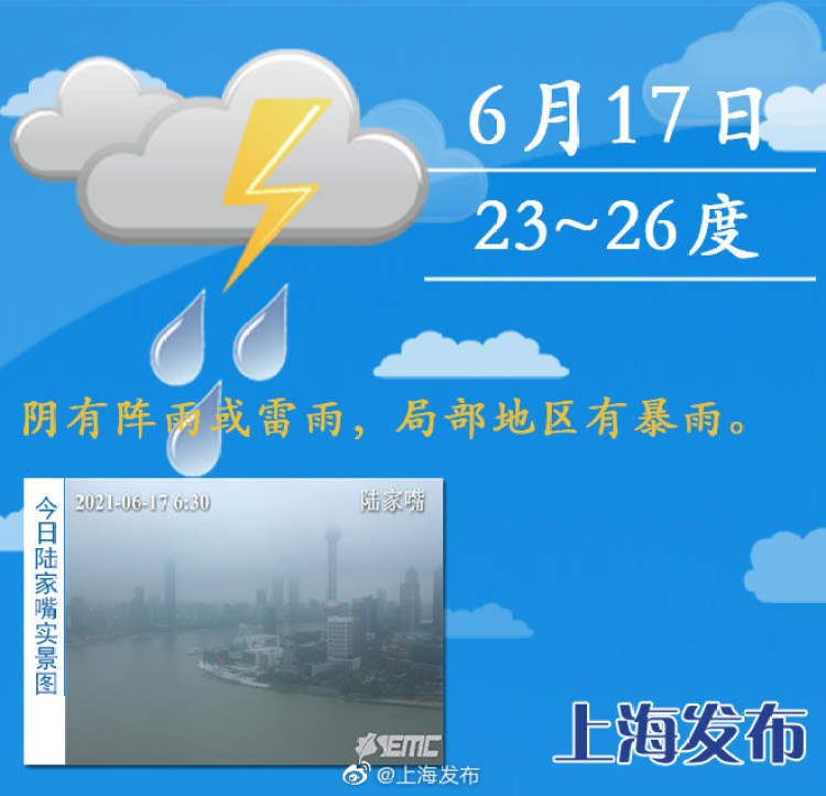 今天有大到暴雨,最高温度仅26℃,有点凉快了 周到君 2021-6-17 来源:周到上海 今天阴有阵雨或雷雨,局部暴雨,伴有雷电、短时强降水,部分地区有7~9级的雷雨大风。降水集中时段主要在今天早晨到上午以及今天夜间。全天气温在23~26℃之间,大家上班途中要备好雨具哦~ 明天可适当进行洗晒工作,周日到下周二又将有一次较明显的降雨天气过程。未来3~5天气温起伏不大,最低气温在22~24℃之间,最高气温在26~29℃之间。 来源:周到上海 作者:周到君 赞一个 (0)