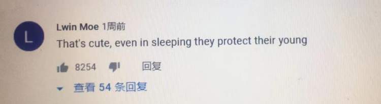 在Youtube上的这段热门视频下方,获点赞数最多的一条评论是:“好可爱,即使在睡觉时,它们也会保护年幼的。”这条评论获得了8000多条点赞。