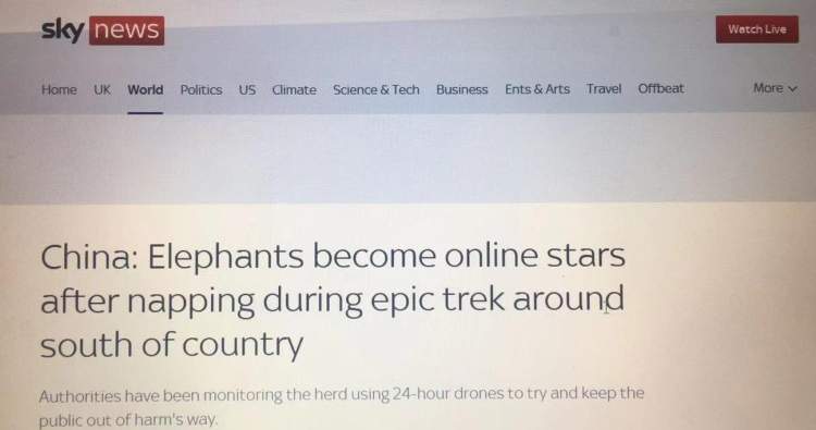英国天空新闻频道网站的报道则点出了这群亚洲象成名的时间点:在中国南部史诗般的迁移过程中,这群大象的打盹照让它们成了互联网上的大明星。