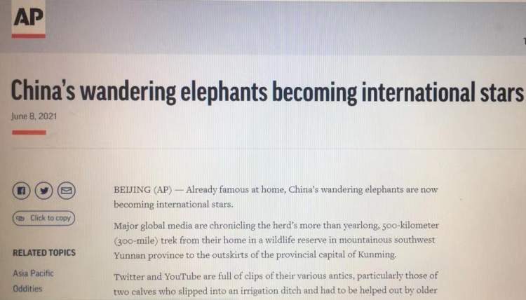 美联社在一篇题为《中国闲逛大象成国际明星》的报道中称,这群大象在中国国内早就出名了,现在则成了国际明星。