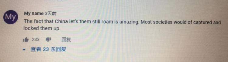 YouTube上一名网友称:“中国还在让这群象漫步,真让人惊讶。大部分国家估计会把它们抓起来,然后锁起来。”