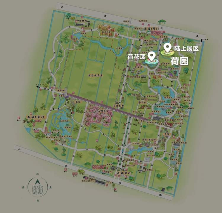 荷园位于东平东大道西侧区域,总面积约4.3万平方米,以“盛世清莲”为主题,以“香泛芙蓉凌波舞,百年芳华呈锦绣”为设计理念,通过布展睡莲、大王莲、荷花等水生植物,打造集品种展示、科普旅游、休闲游憩等为一体的综合性荷花主题专类园,规划陆上与水上两条特色赏荷游线。