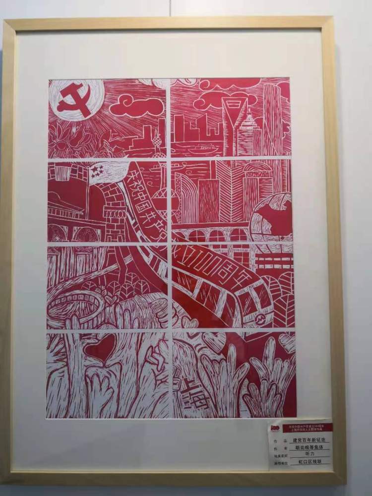 今天展出的残疾人作品,通过不同的形式、不同的画面反映对党和祖国、上海这座城市的热爱。听力残疾人周佳艺此次领衔设计并指导虹口区聋人协会10余名听力残疾人,集体创作了《建党百年新征途》版画,作品由8幅子画组成,作品画面生动、主题鲜明,体现出广大残疾人文艺爱好者团结一致、同心向党的精神风貌。