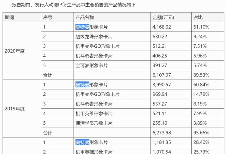 由此算来,去年公司销售奥特曼卡700万张左右,占其同期其动漫IP衍生品2277.07万张销售近三分之一,但销售收入占61%。