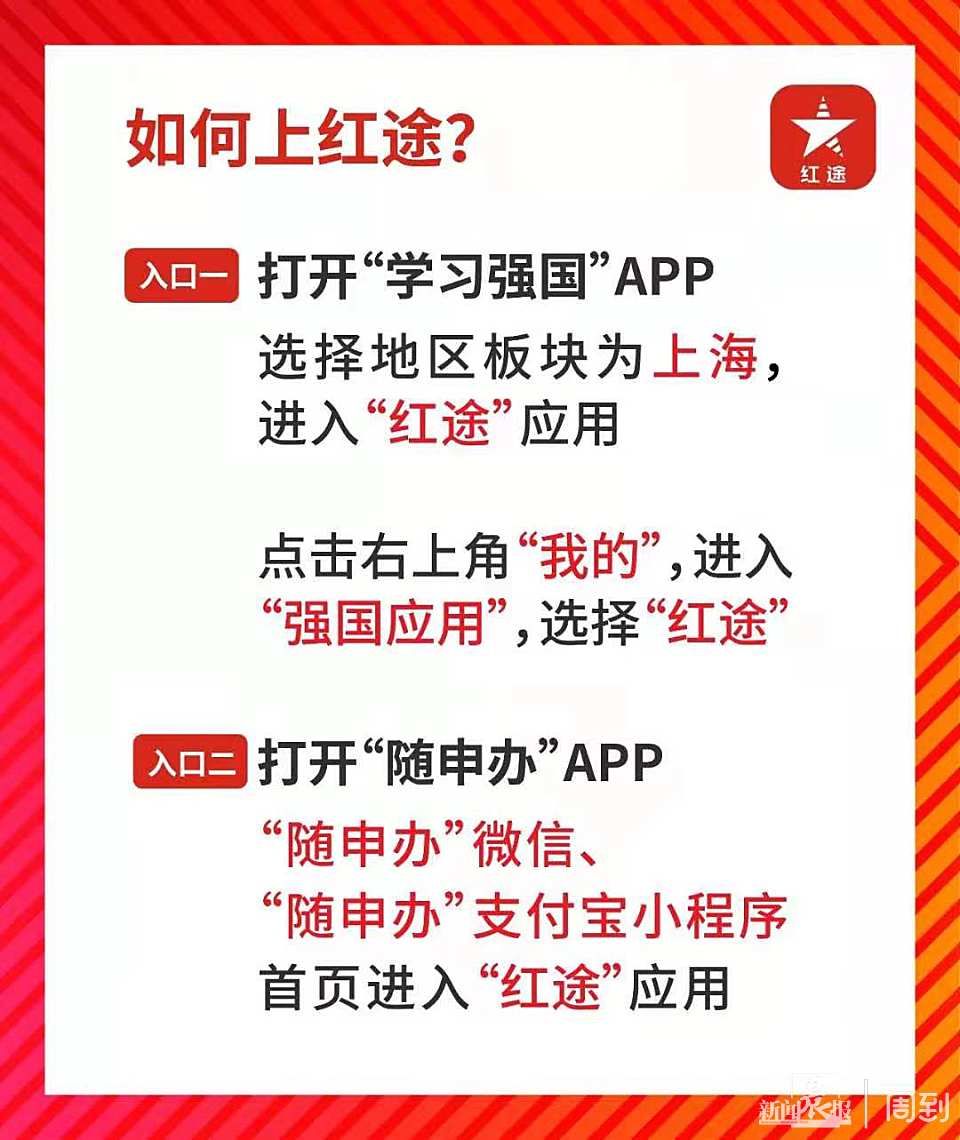 为庆祝中国共产党成立100周年,深入推进“党的诞生地”红色文化传承弘扬工程,上海市委宣传部联合中宣部宣传舆情研究中心,和市各有关单位,在“学习强国”“随申办”系统上建设上海红色文化资源信息应用平台“红途”,实现红色文化资源“一网统管”、红色文化应用“一网通办”、红色文化载体“一站服务”、红色文化资源信息“一站共享”,推进全市红色资源的展示利用、服务管理向科学化、精细化、智能化发展。