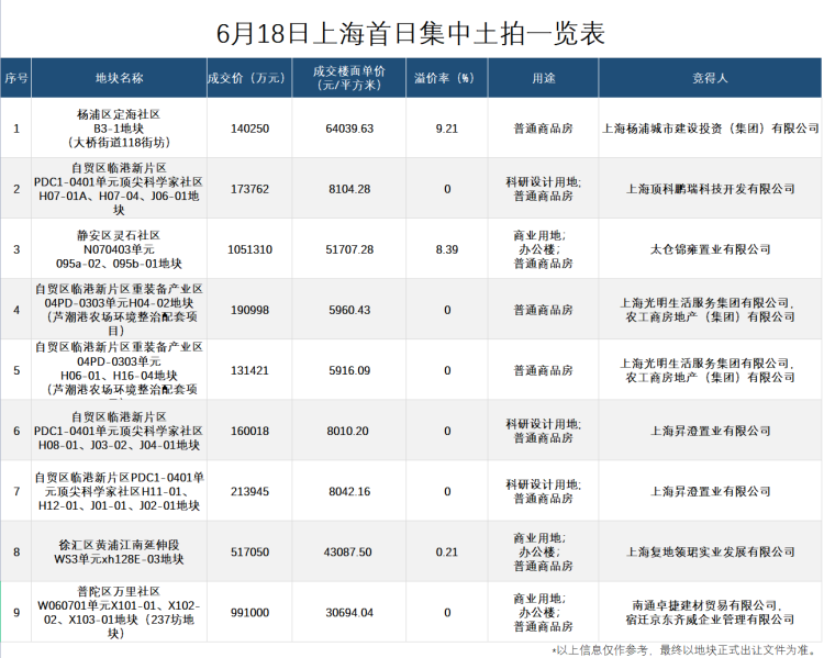 其中,单宗地块成交总价最高的是静安大宁地块,由保利发展105亿元竞得!成交楼面价最高为杨浦定海地块,64038元/平方米,溢价率9.21%,由上海杨浦城市建设投资有限公司拿下。