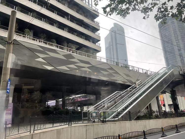 这不,往前走到徐家汇商圈,随着连廊一、二期工程的建造(一期已经完成),人行天桥各出入口都配置了电梯,但也只有上行梯。