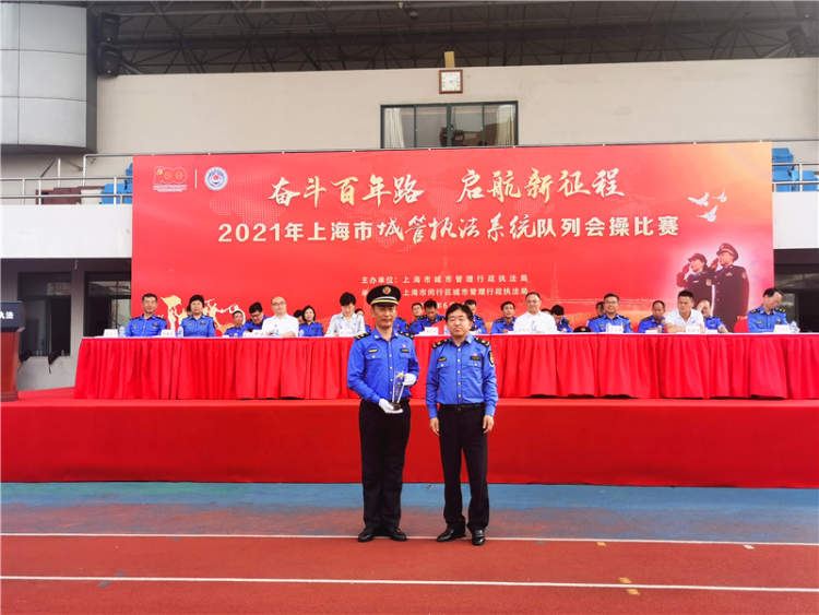 6月16日下午,“奋斗百年路 起航新征程”2021年上海市城管执法系统队列会操比赛在闵行体育馆举行。来自全市各区、临港新片区城管执法系统共17支代表队伍共同参与,经过激烈的角逐,普陀城管桃浦中队凭借出色的临场发挥荣膺桂冠,指挥员王磊获“最佳指挥员”称号。